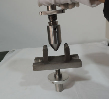 Końcówka jest wycentrowana pionowo na 15 do 20 mm na końcu smoczka, a ciśnienie 200 ± 10 N jest przykładane z prędkością 10 ± 5 mm / min przez 1 ± 0,5 sek. Sprawdź, czy sutek jest przebity.