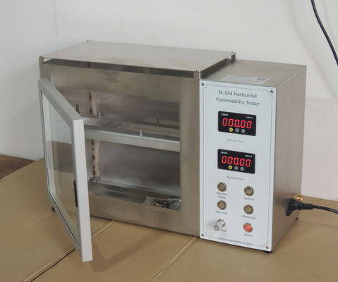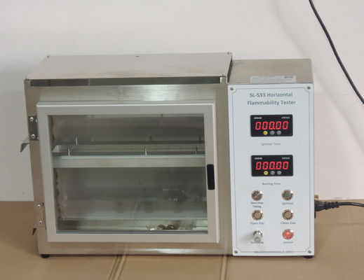 Przyrząd składa się z dwóch części: skrzynki kontrolnej i skrzynki spalania.Próbkę zaciska się płasko zaciskiem i umieszcza na wsporniku komory spalania.Płomień jest zapalany przez skrzynkę kontrolną na pewien czas, a płomień gaśnie.Obserwuj rozprzestrzenianie się płomienia próbki, zmierz czas, w którym płomień rozprzestrzeni się na pewną odległość na próbce, oblicz prędkość rozprzestrzeniania się płomienia i oceń ognioodporność próbki.