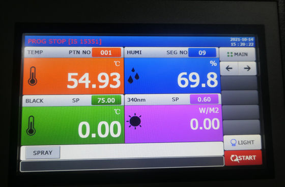 2. Kolorowy ekran dotykowy, wskazujący stan komory w czasie rzeczywistym, możliwość ustawienia natężenia promieniowania, temperatury (BPT, BST, komora), wilgotności i wykreślenia ich dynamicznej krzywej.Operator po prostu wybiera wymagany moduł testowy i standardy testowe;Angielski interfejs użytkownika, diagram wskazujący stan komory, łatwy w użyciu;