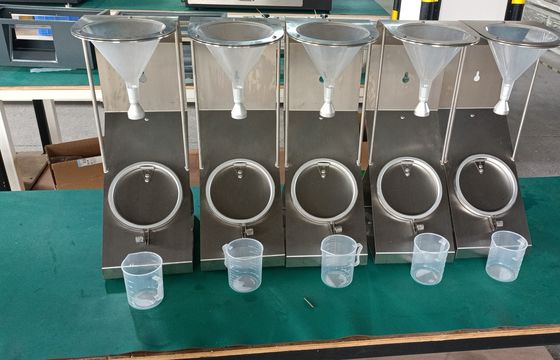 Wyznaczanie odporności na zwilżanie powierzchniowe tkanin.Składa się z metalowej ramy umożliwiającej rozpylanie wody destylowanej przez dyszę na próbkę badaną pod kątem 45° i 150 mm poniżej dyszy.Wygląd okazu porównuje się z opcjonalną skalą fotograficzną.